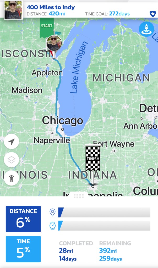We’re off to an amazing start on the journey to Indianapolis. I’ve covered 28 miles in 14 days which is 6% and perfectly on pace to get the remaining 392 miles in 259 days done. Plus y’all have raised just under $400 or 10% of our goal which is incredible! You can follow me on Instagram (@revmomo ) for updates, and I’m including some pictures here as well.